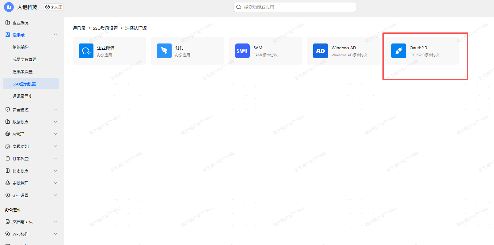 登录WPS管理后台 (opens new window),选择“通讯录” -> “SSO登录设置”,添加Oauth2.0认证源。