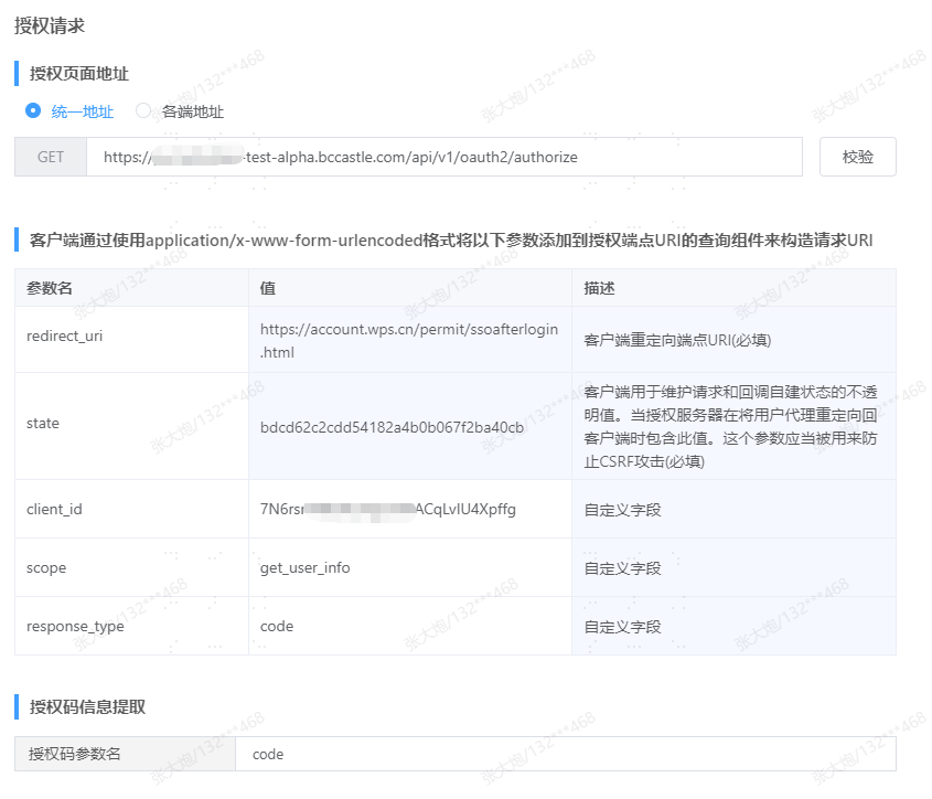 参数 说明 redirect_uri 客户端重定向端点URI,WPS默认是redirect_url,请改成redirect_uri!!! state 客户端用于维护请求和回调自建状态的不透明值 client_id IDaaS应用的client_id scope 固定值"get_user_info" response_type 固定值"code" 配置授权令牌请求。