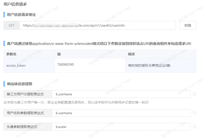 参数 说明 code 授权码 client_id IDaaS应用的client_id client_secret IDaaS应用的client_secret grant_type 固定值"authorization_code" response_type 固定值"code" 配置用户信息请求。