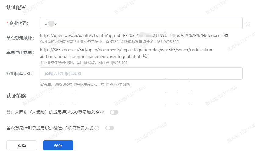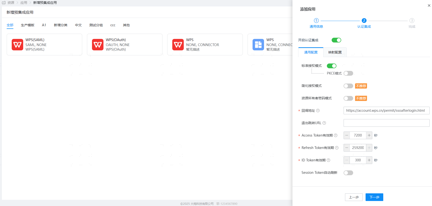 认证配置,其中回调地址填写 https://account.wps.cn/permit/ssoafterlogin.html。