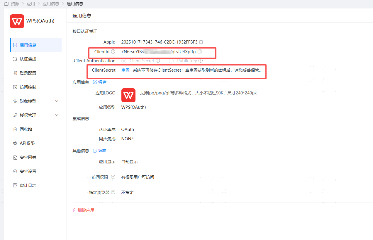 进入应用详情,查看通用信息,获取ClientId和ClientSecret。