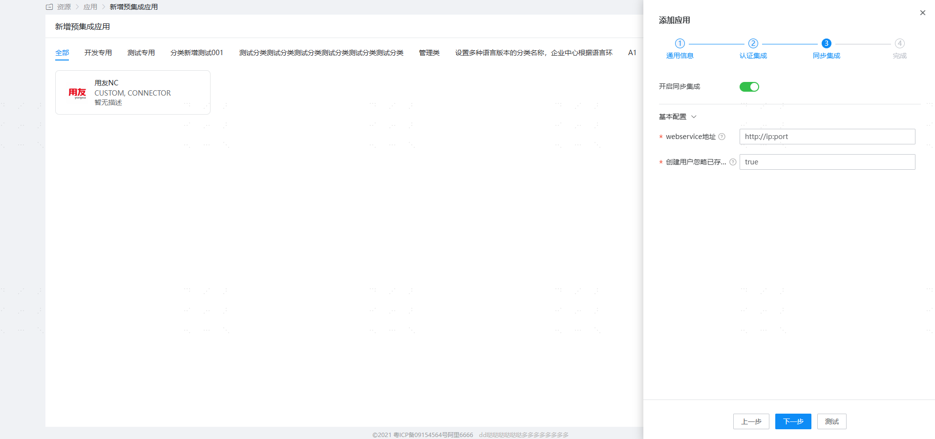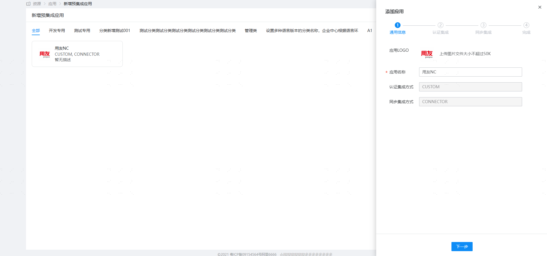登录IDaaS企业中心,添加【用友NC】预集成应用。