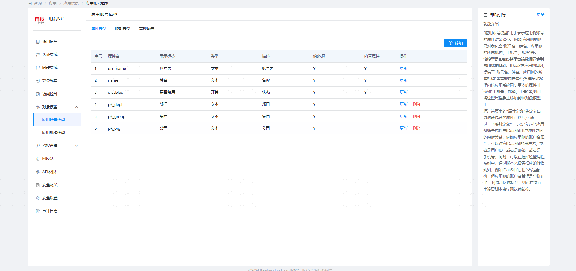 参数 说明 webservice地址 http://host:port 创建用户忽略已存在 true/false, 创建用户时,客户接口提示用户已存在,开启后IDaaS仍然创建成功 配置对象模型,进入应用详情-应用账号模型,模型里保存了系统默认的属性参数,如果需要同步用户的其他属性, 选择左侧的“对象模型 —应用账号模型—属性定义”,单击“添加”,添加属性。