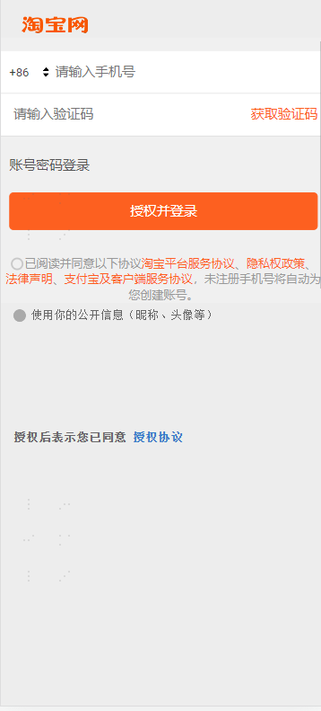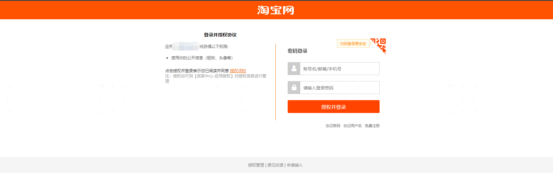 跳转至淘宝后可选择输入淘宝用户名密码或者使用手机淘宝扫描二维码进行登录