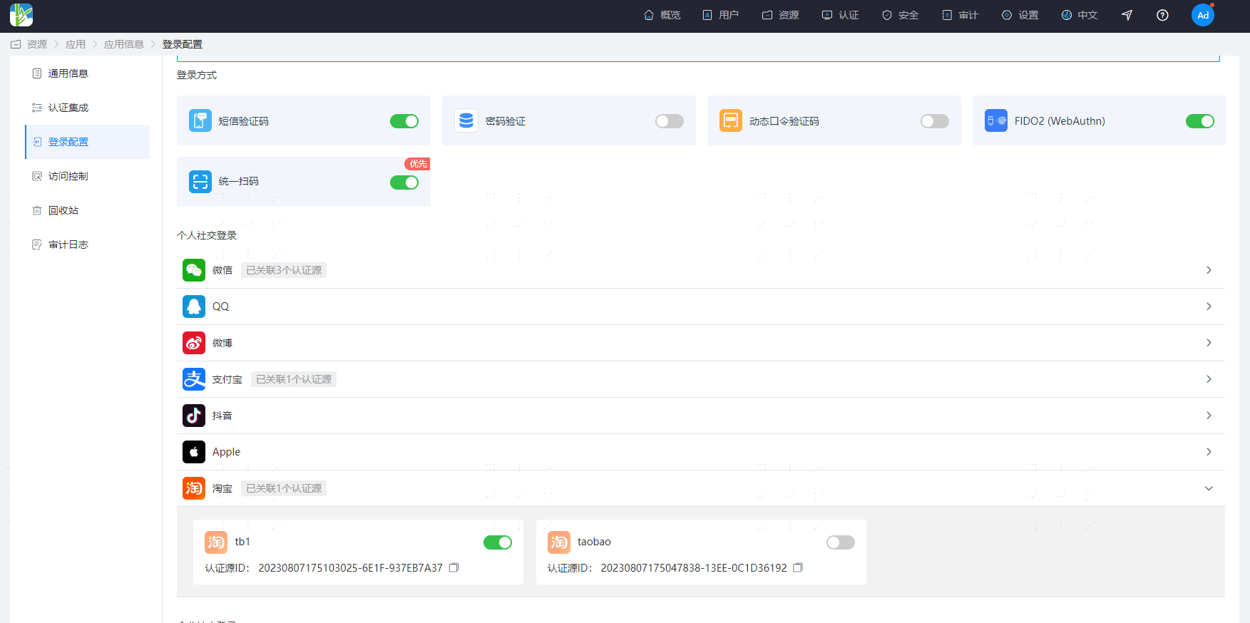 可以配置多个淘宝认证源但是只能使用一个淘宝认证源进行登录,即应用淘宝认证源只能开启一个