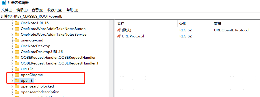 - 通过注册表验证是否安装成功。 打开 【win + R】,输入 【regedit】 查看注册表, 搜索 【计算机\HKEY_CLASSES_ROOT\openIE】 查看自定义协议注册是否成功