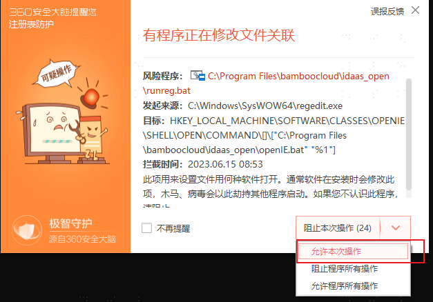 注意:由于该插件会添加注册表,如果本地电脑安装了杀毒软件,可能会弹出相关提示框阻止本次操作,请选择允许本次操作。
